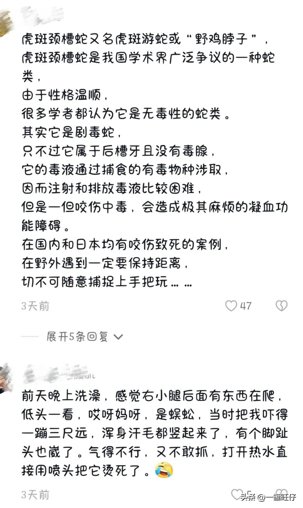 其中一个网友评论说:“这种红脖子绿尾巴的蛇我见过,神秘又好看,应该没啥危险。”而另一个网友则表示担忧:“听说寒毛卓竖能毒人,这可不能大意!”