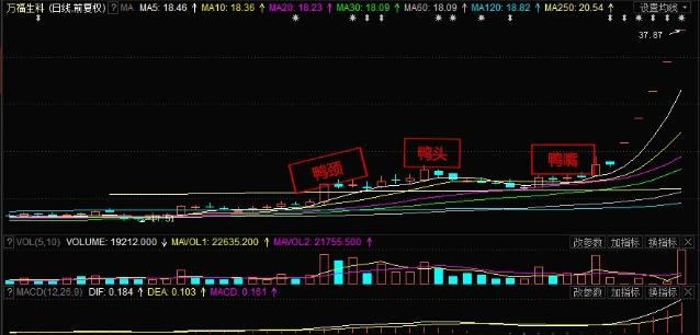 简易理解:盘中主力吸筹造成三条均线上行,5日与10日均线缩量下行是主力的洗盘行为。等它们再次金叉,第二波主升浪开始。5日均线上穿10日均线时所形成的图案,很像个鸭头,行家都称之为老鸭头。
