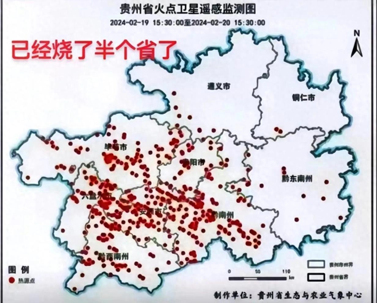根据贵州省生态与农业气象中心发布的贵州省火点卫星遥感监测图,我们可以看到想,在2月19日至20日,火势已经几乎蔓延了大半个省份。