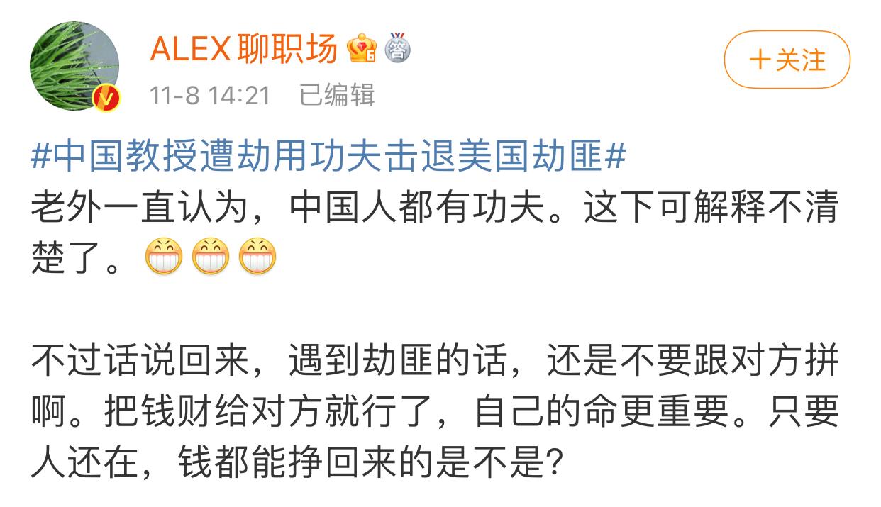 也有网友表示同意周教授的劝告,“虽然说这次周教授打跑了匪徒,但是我个人非常不建议以武术对抗枪支。因为枪响之后,一切武术白搭。如果遇到持枪抢劫,最好的办法是尽量不激怒匪徒。”
