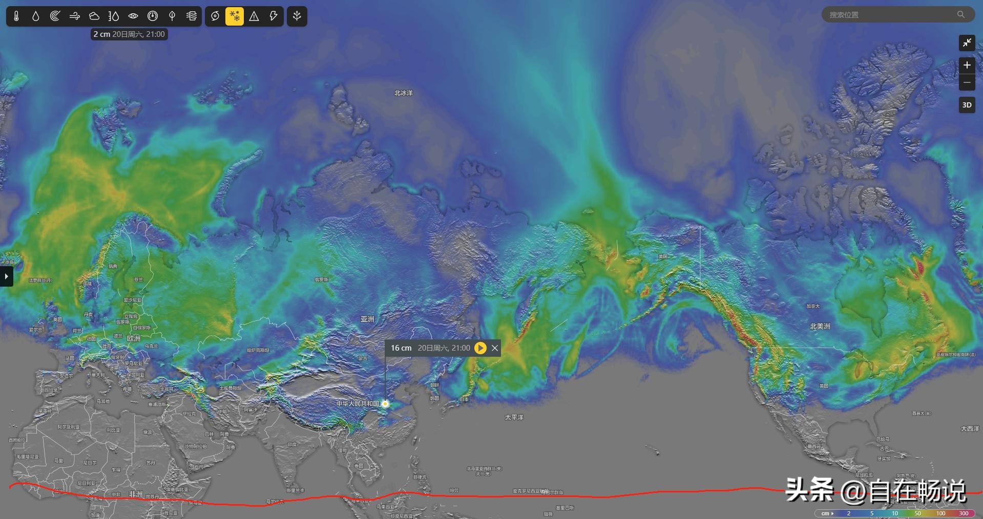 红色线为赤道附近,不标准,大家见谅!陕西、河南的很多朋友下周可以堆雪人了,雪量不小。