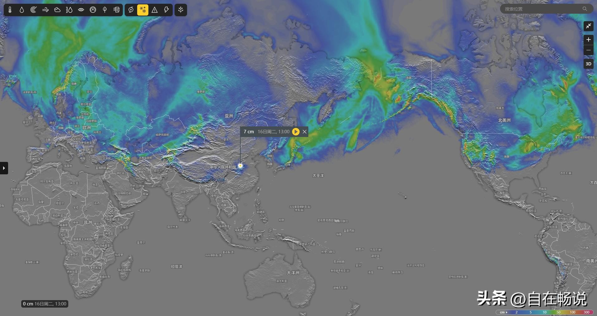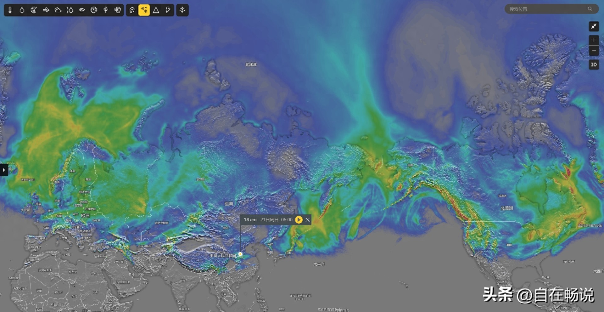 这个是下周六降雪地图,北半球中纬度或高纬度的地区,将几乎全被冰雪覆盖。