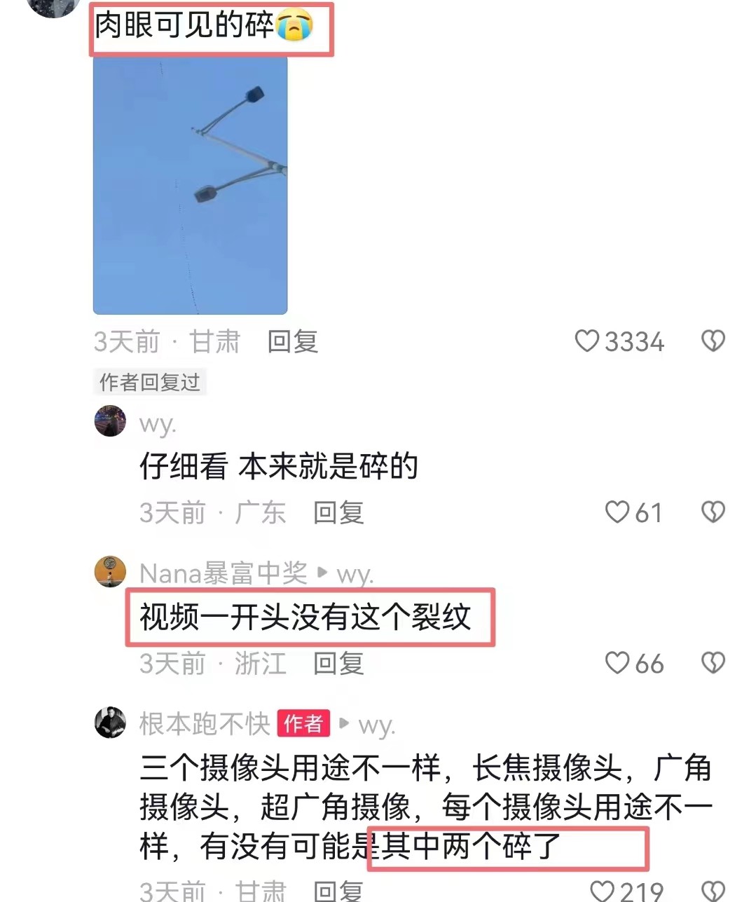 细心的网友还发现,手机摔下去后,视频画面中可以看出,肉眼可见的一大条裂痕,作者说摔碎了两个摄像头。