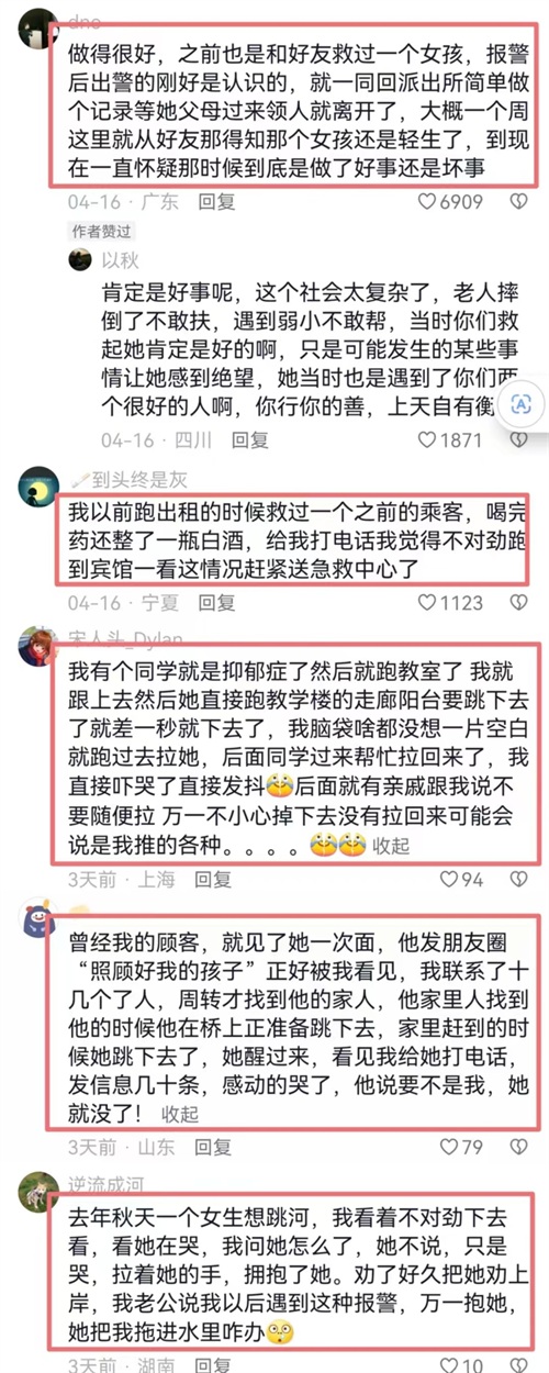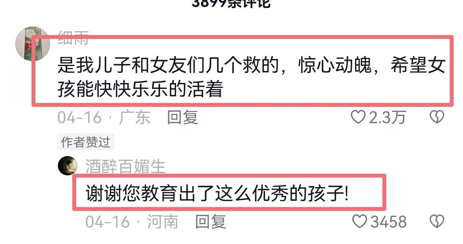 救人作者的妈妈还跟帖说是他儿子和几个女性朋友一起救的人,当时惊心动魄,她还希望被救女孩以后能好好活着。