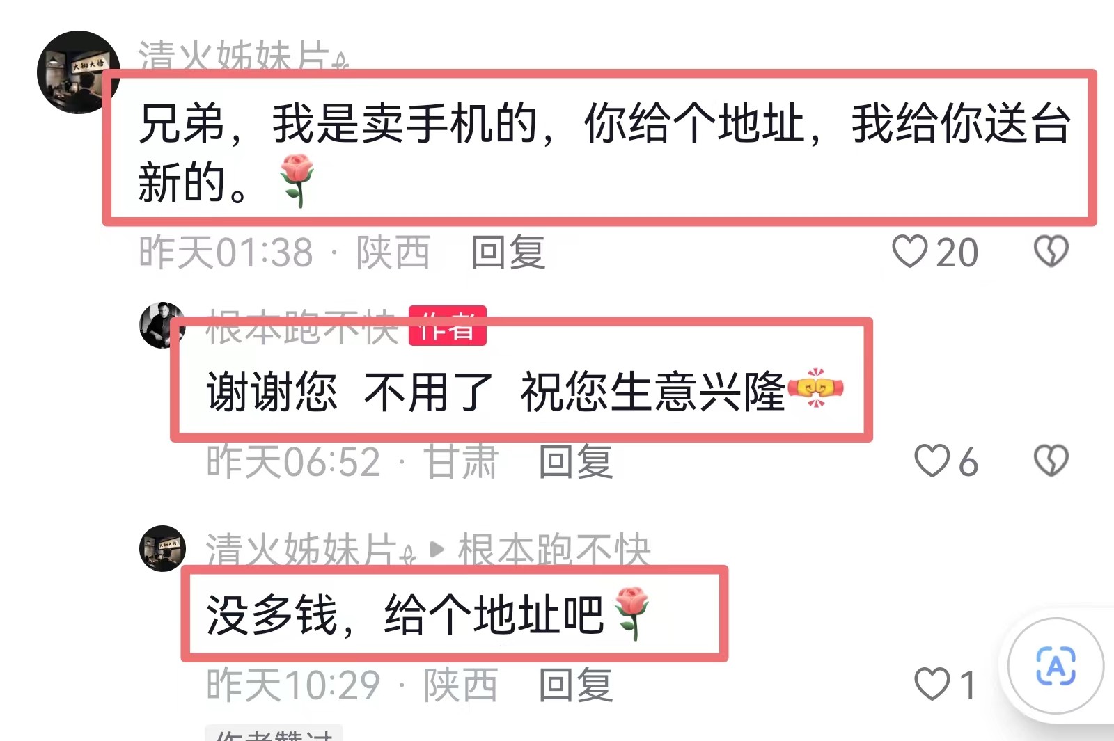 还有一个卖手机的老板,跟作者说让他给个地址,送一台新的手机给作者,也被作者拒绝了,还不忘祝老板生意兴隆。