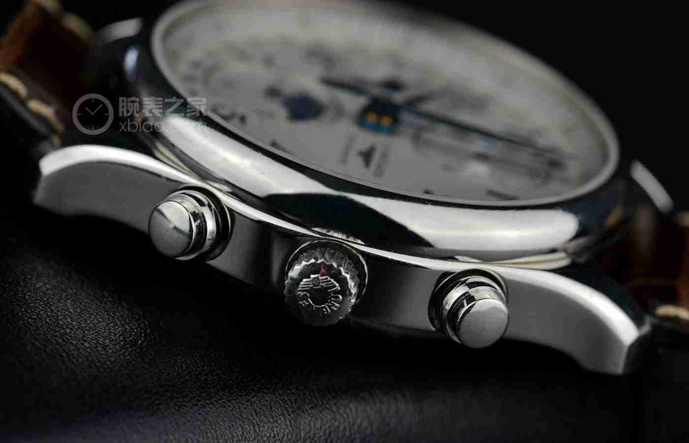 表壳2点位置设有启动/停止计时按键和计时盘切换与关闭按键,3点位置设有腕表表冠,4点位置为计时指针和计时盘归零按钮。