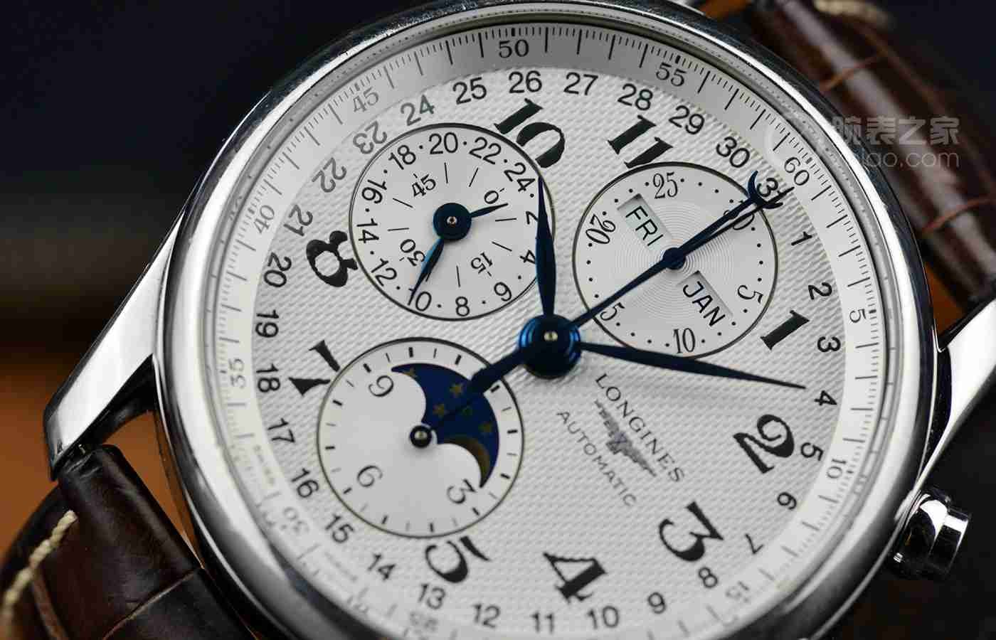 表盘9点位置设24小时表盘,6点位置设月相显示功能和12小时计时表盘,12点位置设30分钟计时表盘,并配备星期与月份显示窗。