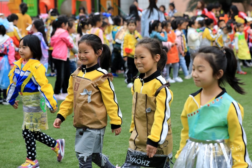 4月22日,吉首市思立幼儿园小朋友在展示“环保时装”。当日,该园举行环保时装展示活动,老师和小朋友们用纸箱、报纸、薄膜等废旧物品制作服装在校园走秀,倡导绿色环保低碳的生活理念,庆祝“世界地球日”。(彭彪/摄)