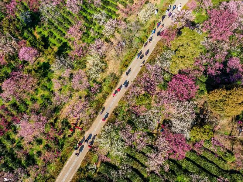 2021年2月19日,江苏南京。春天的梅花山香粉粉的,从空中俯瞰,犹如打翻的调色盘,一树一树的梅花竞相开放,层层叠叠。这里种植了万株梅花、400个品种,被称为“天下第一梅山”。(东方IC)