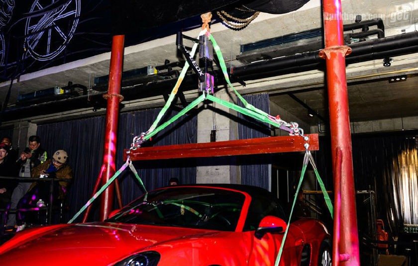 野兽骑行在现场找了一辆保时捷跑车来演示,SPEEDX LEOPARD车架能够支撑几吨的重量