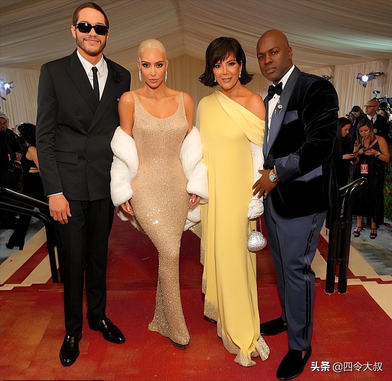 这位卡戴珊家族的明星戴着黑色波波头假发,搭配她奢华时尚的奥斯卡·德拉伦塔黄色丝质礼服,银色镶边出席年度活动。她戴着长长的白色手套,佩戴着Lorraine Schwartz珠宝和Tamara Mellon鞋子,前往派对现场。与此同时,在时尚界最盛大的晚会上,科里·甘布尔身着深蓝色燕尾服,显得很潇洒。