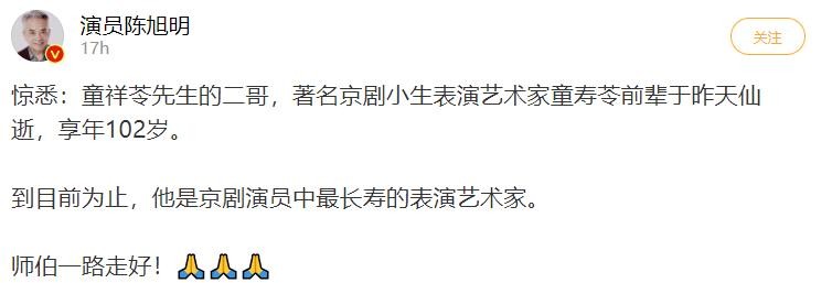 演员陈旭明,通过自己的个人社交平台发文悼念。