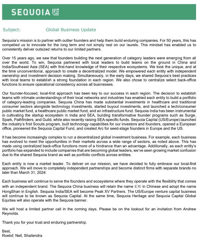 正因如此,红杉决定充分拥抱 " 本土优先 " 的策略,将在 2024 年 3 月 31 日前实现各个实体之间的完全独立运营。红杉中国将继续使用 " 红杉 " 这个中文名,英文名称将改为 "HongShan",红杉印度 / 东南亚将改名为 Peak XV,欧美风投业务将继续使用 "Sequoia Capital" 的名号。