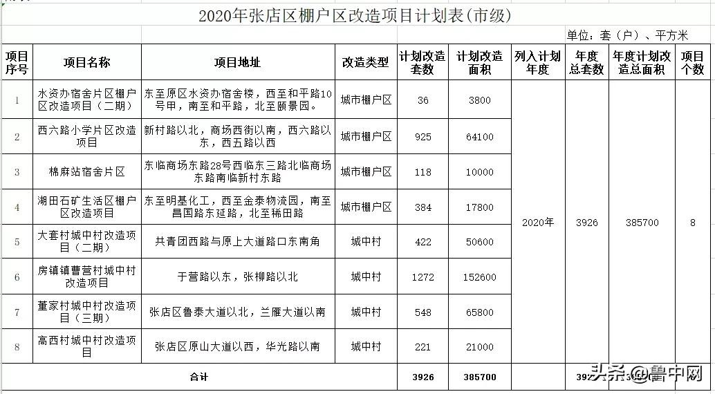 按照市委、市政府部署要求,经区政府研究,制定了张店区棚户区、老旧小区、旧村改造三年行动计划。其中,2020年张店区计划棚户区改造3926套,老旧小区改造2718户,旧村改造项目7个,新建3337套 。现将2020年张店区棚户区、老旧小区、旧村改造项目进行公布。请各有关单位认真贯彻落实,按时保质保量完成年度任务。