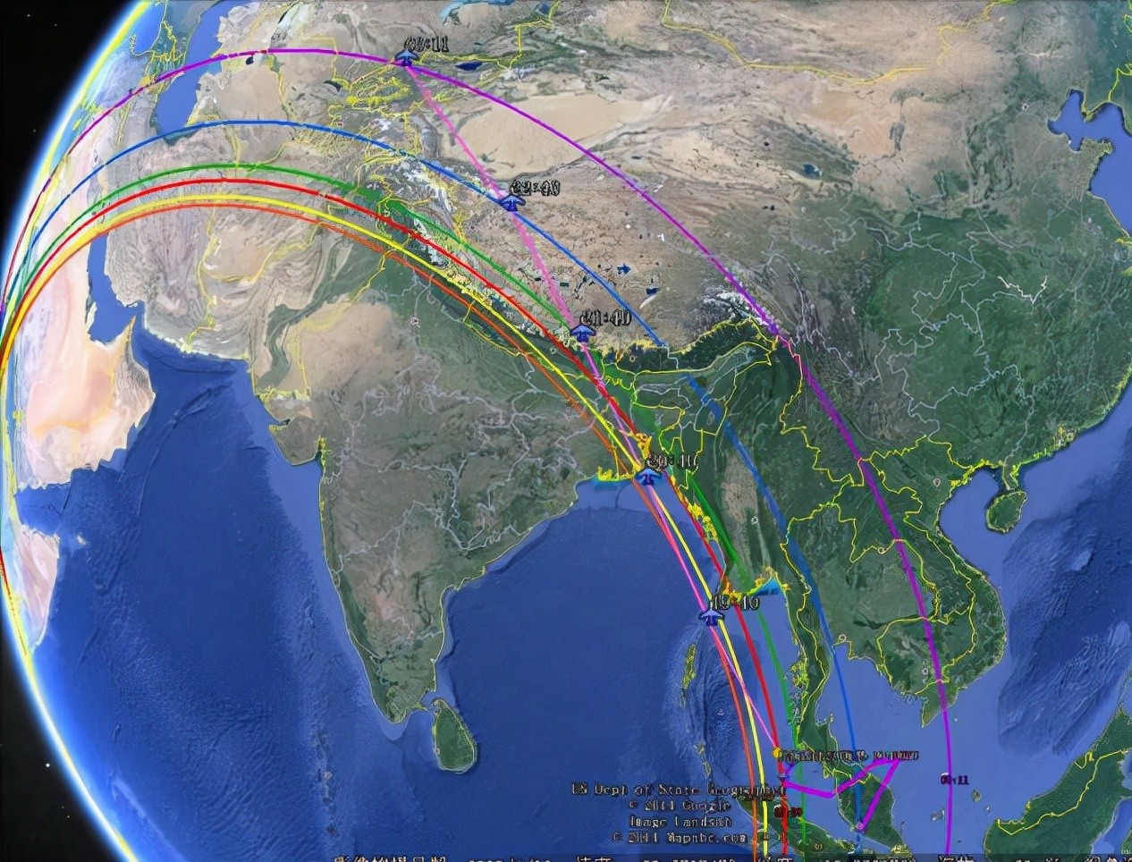 专业人员对马航曾经发出的信号做了对比,推测出马航失联之后可能飞行的轨迹路线。