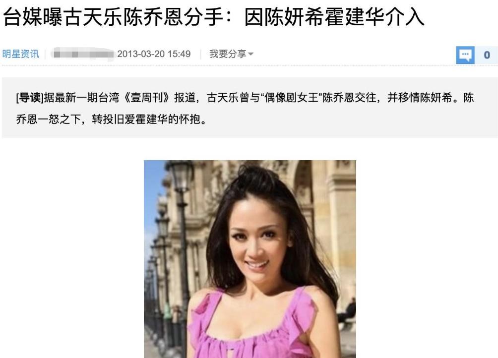 而在这之后,陈乔恩和古天乐在一起已有一年,却要闹分手的事情闹得沸沸扬扬时,却有媒体爆出,古天乐和陈乔恩分手是因为陈妍希的介入。