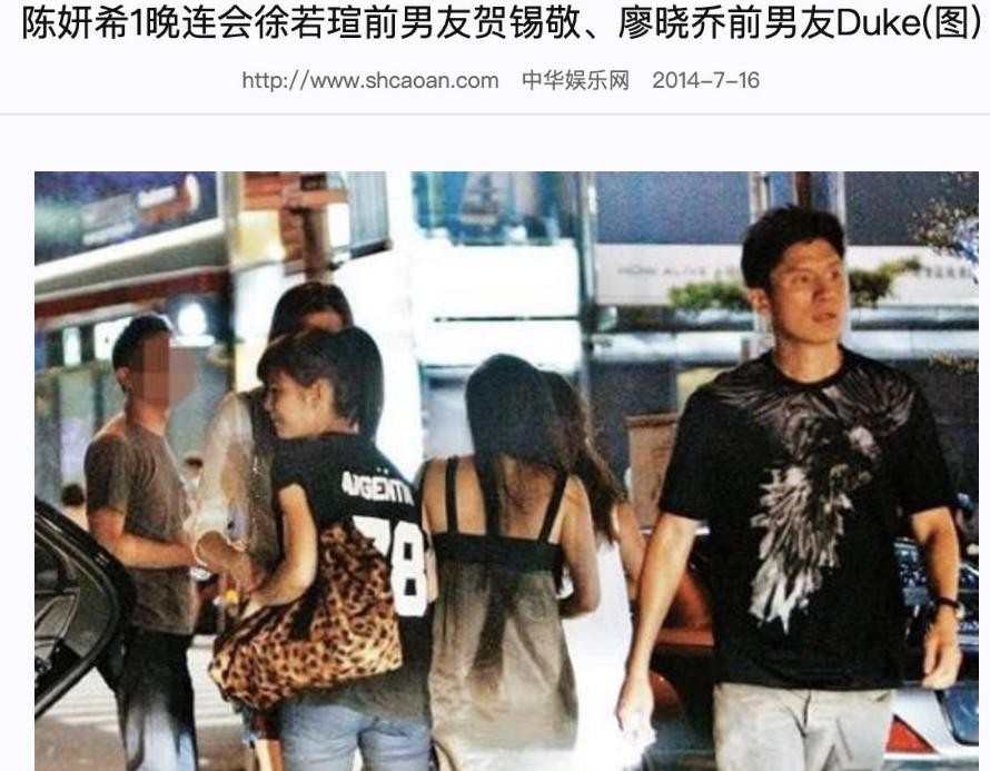 2014年,她被拍到一个晚上和两个男人约会,一个是徐若瑄的前男友贺锡敬,另一个则是廖小乔的前男友Duke。