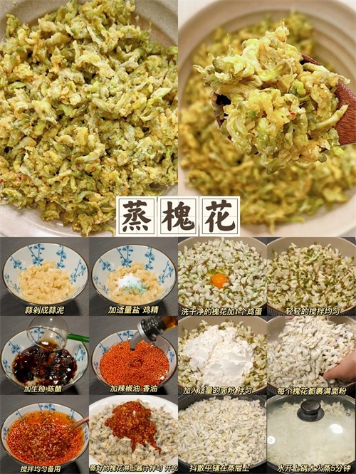 蒸槐花:槐花洗净后控干水分,倒入盘中并撒上面粉,浇上植物油后充分搅拌。然后将拌好的槐花均匀地铺在篦子上,锅内烧水,水开后放上篦子,蒸3分钟左右。蒸好后取出,用筷子抖散,撒上食盐,倒入调好的调料,搅拌均匀后即可食用。