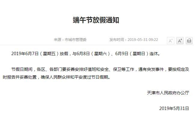 2019年6月7日(星期五)放假,与6月8日(星期六)、6月9日(星期日)连休。
