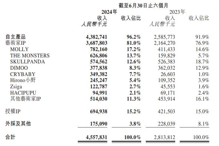 公司呈现IP多元化趋势,截至2024年中报,形成了MOLLY、THE MONSTERS、SKULLPANDA、EDIMOO的四大核心IP。