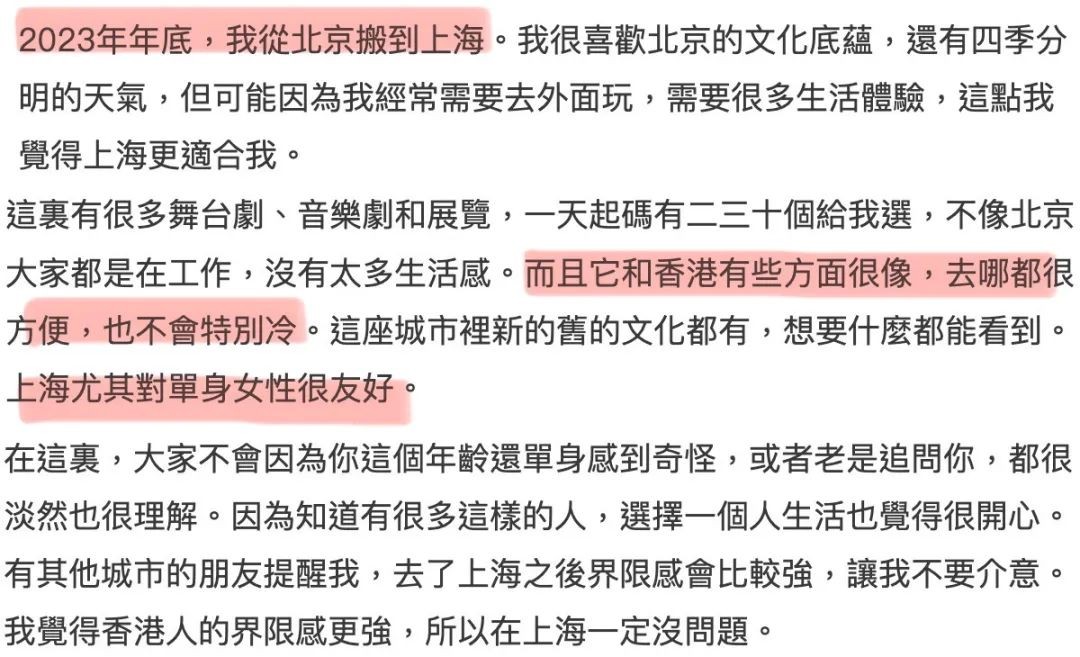 之所以选择上海,是因为邓萃雯觉得比起北京,上海的文化生活更为丰富,而且气候和香港很接近,最重要的是,上海的社会氛围对于像邓萃雯这样的单身女性来说非常友好。