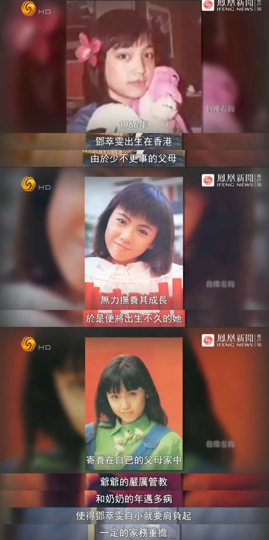 1966年,邓萃雯刚一出生即被父母丢在爷爷奶奶家,爷爷奶奶似乎对这个小孙女无甚疼爱,只是尽到抚养义务,邓萃雯从小就要在家中承担大量家务,童年唯一的娱乐就是晚上跟着长辈一起看电视剧。