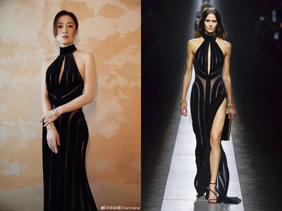 佘诗曼身着Tom Ford2024秋冬系列黑色镂空露肩高开叉礼服,性感洒脱。