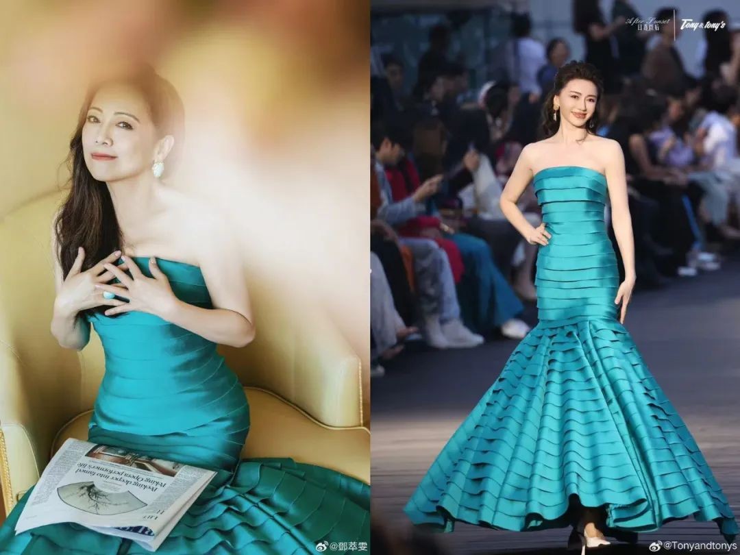 邓萃雯这身青绿色缎面鱼尾礼服来自深圳本土设计师品牌Tony&tony's,衬得整个人分外娇俏。