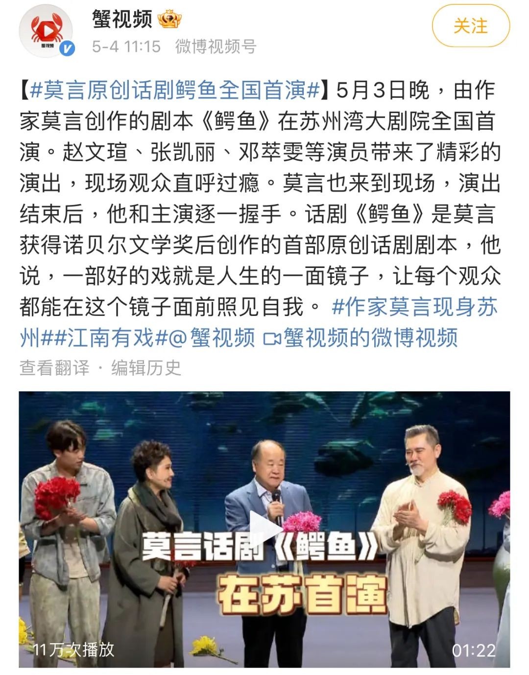 《鳄鱼》是莫言的首部话剧作品,主演除了邓萃雯,还有赵文瑄和张凯丽,个个都是老戏骨。