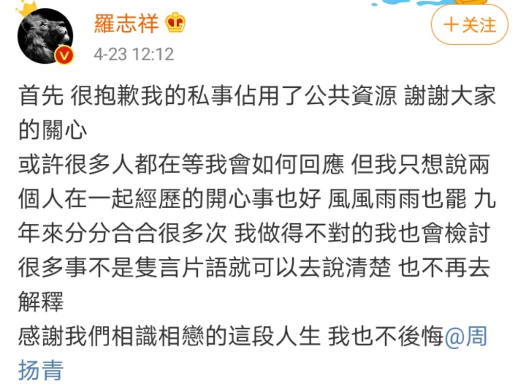 前天又有爆料称有艺人被拍到恋情,众人猜测纷纷,昨天早上起来一看,原来是彭昱畅(彭昱畅是早上九点四十九发的微博承认恋情,而周是在上午九点发的微博,所以不排除彭昱畅是被拉出来想转移大众视线,降低周扬青曝光的热度的,但是好像很明显,大众更加关心罗志祥和周扬青,彭彭恋爱这个瓜起不到转移热度的作用),本以为彭彭公布恋情肯定会预订热搜一位,万万没想到上午九点的时候罗志祥女友啊不对应该是前女友周扬青发了一篇微博,是写给罗志祥的信,可以说是声明类型的范本了,生动形象,起承转合巧妙,引人入胜虽然是一篇声明,但是又不像一篇普通声明一样刻板无趣,先是写的和小猪的回忆,又从回忆拉回现实,以一种平静但却透露出绝望的语气接揭露了与猪分手的原因——每到一个城市就有女生做伴、长期跟公司女艺人和化妆师保持不正当关系、进行“多人运动”,让她感觉不能接受,本来打算好聚好散但是为了防止更多女生被他欺骗,她决定曝光罗志祥。