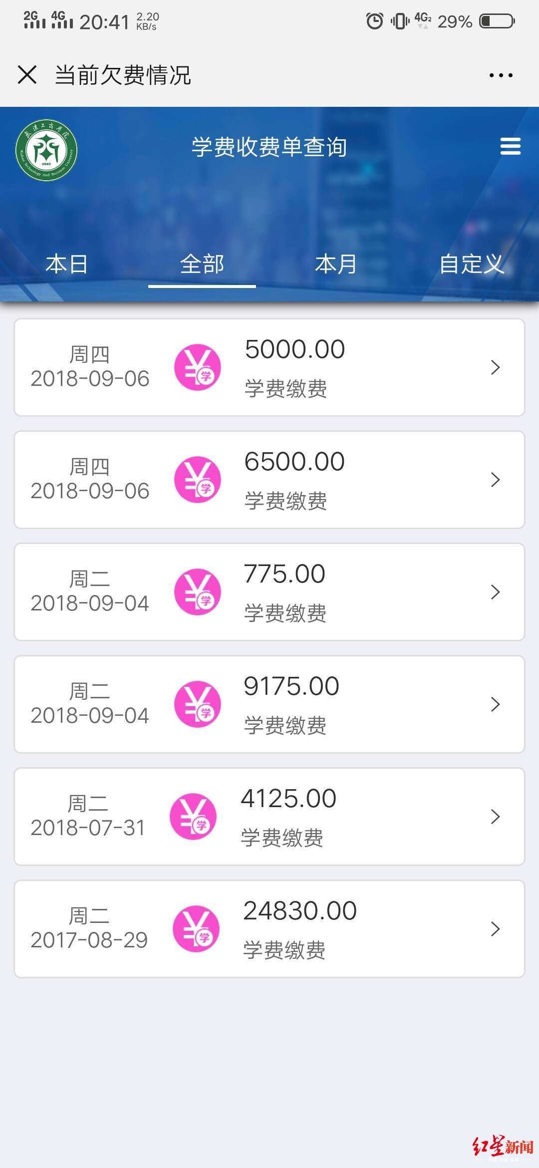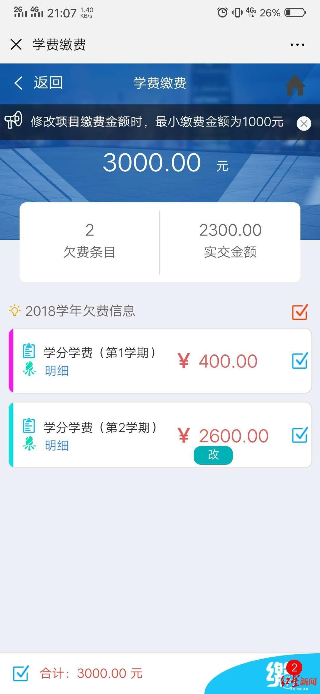“最近我们学校官方收费系统显示我们欠费,我欠费2800元。问了一下身边朋友,都是1000元到3000元不等。”苏琳向红星新闻记者提供的一份欠费截图显示,2017年第2学期到2018年第2学期,她共欠学分学费2800元,其中2017年欠费100元。她表示完全不明白学校是怎么计算的,“这都2019年了,居然还有2017年的。”