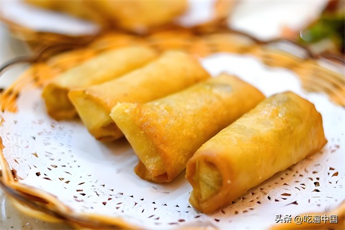 炸春卷是一种以春卷皮为主料,通过油炸制作而成的传统美食。 春卷皮通常由面粉制成,内填充有各种食材,如肉类、蔬菜和调味料,吃起来香酥美味,营养又很丰富,所以成为农家的招牌菜品。