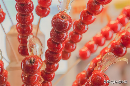 糖葫芦,又叫冰糖葫芦,起源于南宋时期,是一种将野果用竹签串成串后蘸上麦芽糖稀的小吃。这种糖稀在遇风后会迅速变硬,形成了糖葫芦独特的外表。糖葫芦在北方冬天尤为常见,通常以山楂为主要原料,串成后蘸上糖稀,冻硬后食用,口感酸甜且冰凉。