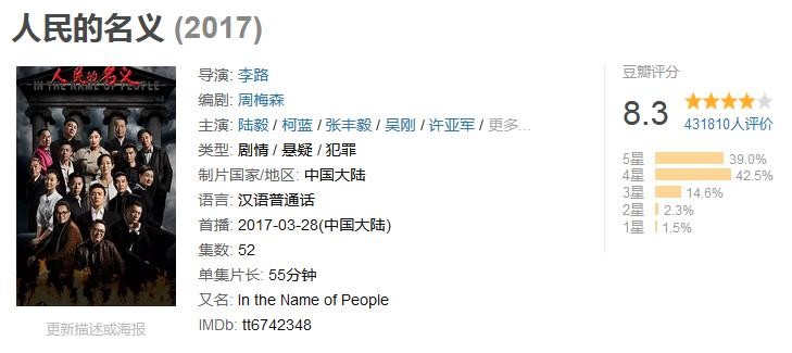 足足43万人打分、拿下8.3分高分的《人民的名义》,以极大尺度地批判官场腐败而收获广泛好评,在2017年成为年度现象级爆款。