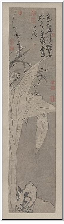 此图采用半边式构图,将所绘梅花、芭蕉集中在画幅左侧,仅以小块湖石点缀画心底部,求得欹侧中见平衡。全画用淡墨染地,表现暮色沉厚的雪景,蕉叶、梅花皆以舒缓的细笔淡墨勾画、点写,不求形似,略具大意而已,尽显画家自信不逊前贤,“大叶尽胜摩诘雪”(见《徐文长逸稿·卷四·“芭蕉”诗》)的孤高个性和创作水平。