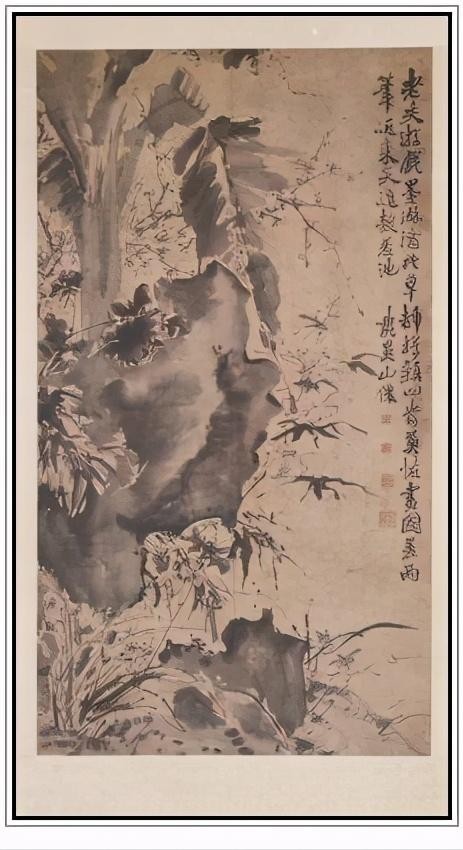 图中画藤花、梅、芭蕉、牡丹、秋葵、竹、水仙、兰等花草树木,缀以大块湖石。花草皆以草法挥写,不仅体现了作者一向标榜的“不求形似求生韵”的艺术思想,并以其惯有的题画风格将胸中郁结的愤懑之气行诸诗文,以“老夫游戏墨淋漓,花草都将杂四时。莫怪画图差两笔,近来天道彀差池”之句来讽喻世事,赋予了传统花卉画以深刻的社会寓意。