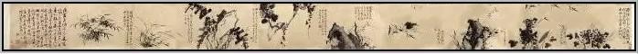 作者分别以大写意手法绘牡丹、芍药、葡萄、芭蕉,以兼工带写的手法绘桂花与苍松,以烘托法描绘雪中的竹、石、梅花,技法灵活多样,笔墨酣畅,不拘泥于形,旨在追求神韵。从卷尾自识看,画家是借物抒发胸中的抑郁。此画卷风格简洁洗练,豪爽奔放,显得畅快淋漓。