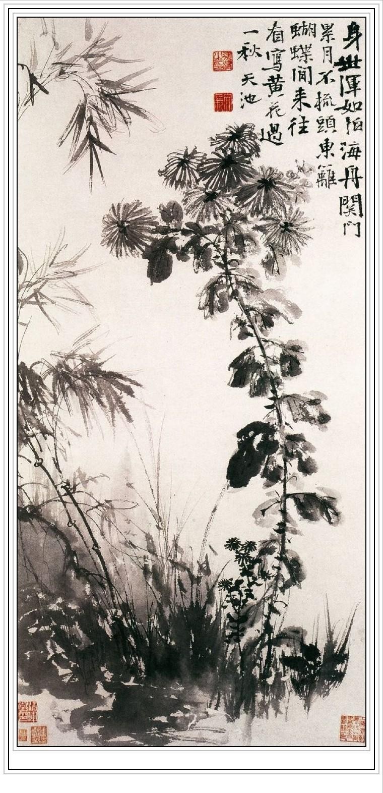 本幅自题:“半生落魄已成翁,独立书斋啸晚风。笔底明珠无处卖,闲抛闲掷野藤中。天池。”钤“湘管斋”印。鉴藏印有:“竹朋真赏”、“陈希濂印”、“北平韩德寿审定真迹印”、“夏山楼藏书画记”、“毂水过眼”。