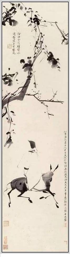 图上树枝间所盘青藤纷披垂落,树下一老翁乘驴缓缓而过,仿佛正在吟哦诗句,悠然雅适。宋代孙光宪的《北梦琐言》(卷七)中记载,唐时有人询问诗人郑棨近来是否写有新诗,郑棨回答:“诗思在灞桥风雪中的驴子上,此处何以得之?”此后,表现诗人骑驴游山涉水寻诗觅句的题材逐渐为画家们所青睐。徐渭的这幅画当属此类绘画中以笔墨意趣取胜的佳作。他画人物多用“减笔”法绘出,且构图简略,往往只画前景,远景常几笔带过,有时甚至完全省略。《驴背吟诗图》上老翁和驴仅用寥寥数笔便形神俱备,尤其是对驴子的描绘,用解剖学的眼光看驴的造型并不准确,而它那踏着轻快步伐的神气却跃然纸上。背景树枝、藤蔓则笔点零乱,使人顿有秋色萧索之感。运用恰到好处的省略手法,徐渭营造了一个空而不虚、意境深远的艺术空间。以书法笔意入画是《驴背吟诗图》的又一特色。图中人、驴、树、藤的画法隐有真、行、草、隶之笔意,令人感觉其间有一股勃勃不息的活力,这正是徐渭之画能脱俗免尘、卓尔不群之处。