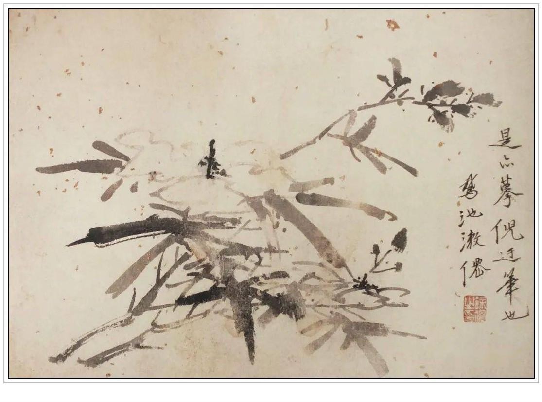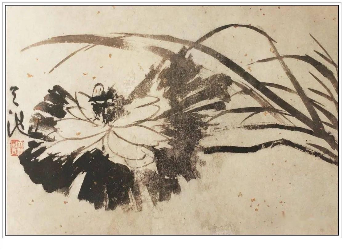 画上方题诗是徐渭诗作中的精品,暗示了画作的初衷与指向。诗句以荷寓世,抒发了自己怀才不遇的愤懑和世事不公的不忿之情。带着这样的感情基调,再去看作者笔下的荷花荷叶。荷叶以浓墨点厾、散锋扫出,几不类物象,似乎作者对它无丝毫的好感,故破笔一挥而已。荷花则以淡墨中锋,狂草笔法飞快勾出,无心求工。荷柄与水草也以长锋写出,任其浓淡干湿、中锋侧锋亦不计较。最后,作者似乎还未发尽心中的激情,以重笔在画面下角点了七八个大小不同的墨点,暗示了水中的浮叶。