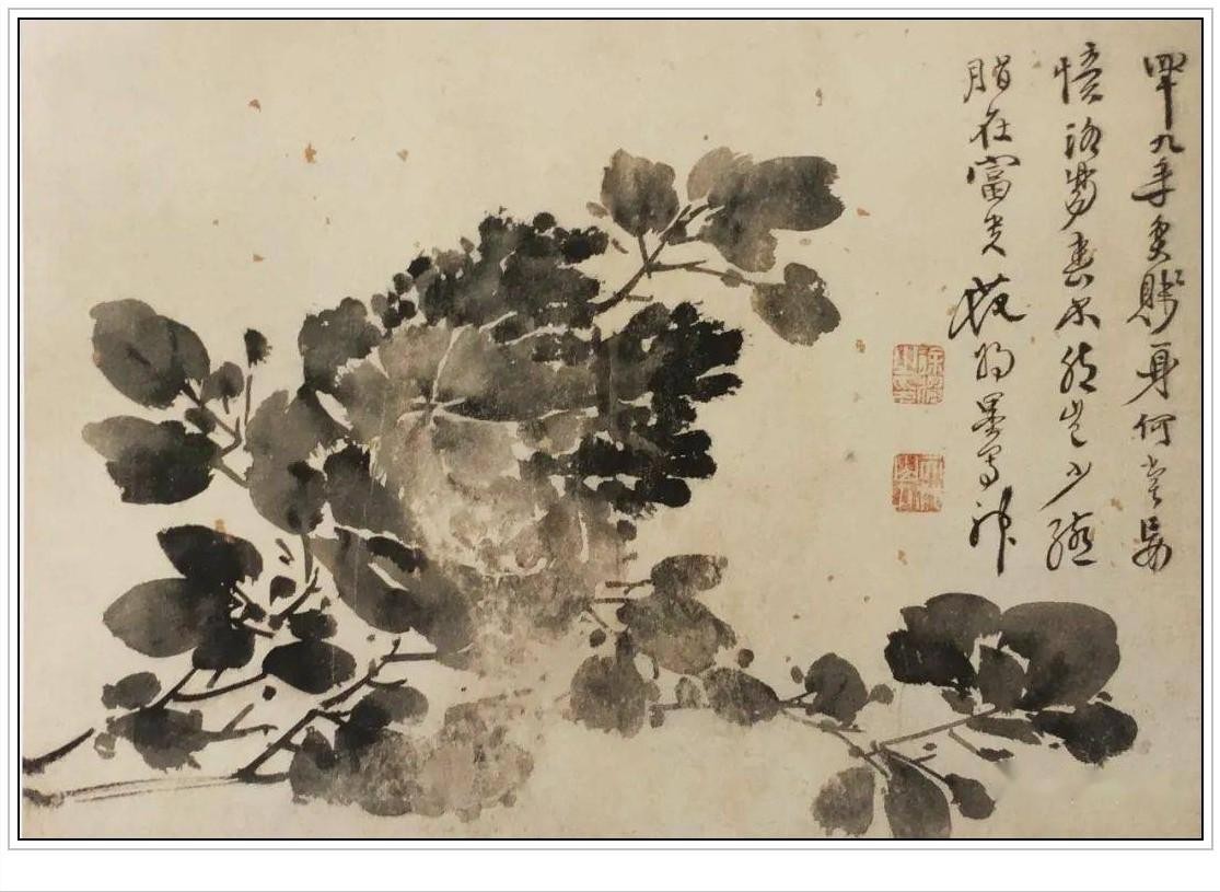 图中画一架葡萄,叶片茂盛,藤蔓缠绕,果实累累。作者以草书笔法作画,行笔豪迈而不肆野,叶、果用淡墨加胶矾挥洒,墨气淋漓酣畅,产生了极佳的晕散效果。