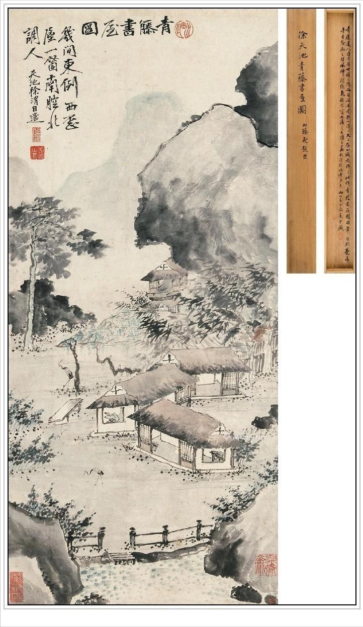 款识:青藤书屋图。几间东倒西歪屋,一个南腔北调人。天池徐渭自遣。