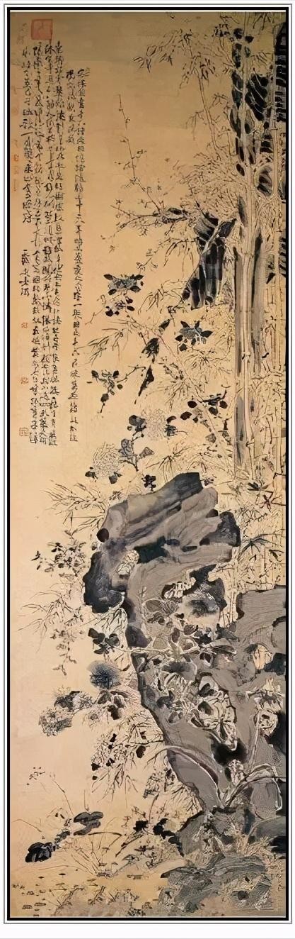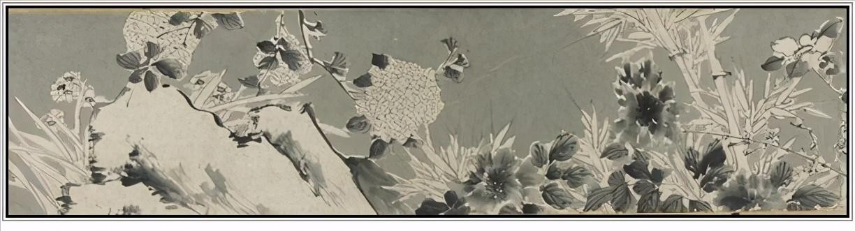 本幅以水墨图绘竹石与花卉,根据他自己的题款,应该有十六种花。画中以微细多样的墨色变化,大笔刷出石面,双钩白描画竹,画花的笔法则快速恣肆,时见晕染与水墨流动,但墨调层次变化很多,画面活泼热闹而有生意。对画家而言,笔情墨趣的表现显然比精细描绘景物更为重要。