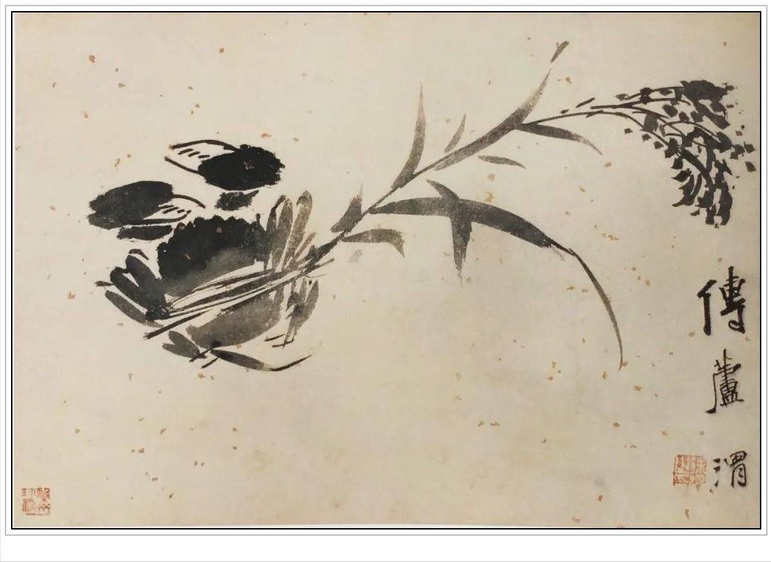 图中的水墨加入了适量的胶,以避免水墨渗散,恰是此图的特色所在。图中以淋漓的墨色画荷叶,画蟹则寥寥数笔,看似草草为之,实则浓、淡、枯、湿、勾、抹、点多种笔法参用,形状虽夸张,却饶有笔情墨趣。画上自题诗曰:“兀然有物气豪粗,莫问年来珠有无。养就孤标人不识,时来黄甲独传胪。”诗意幽默。