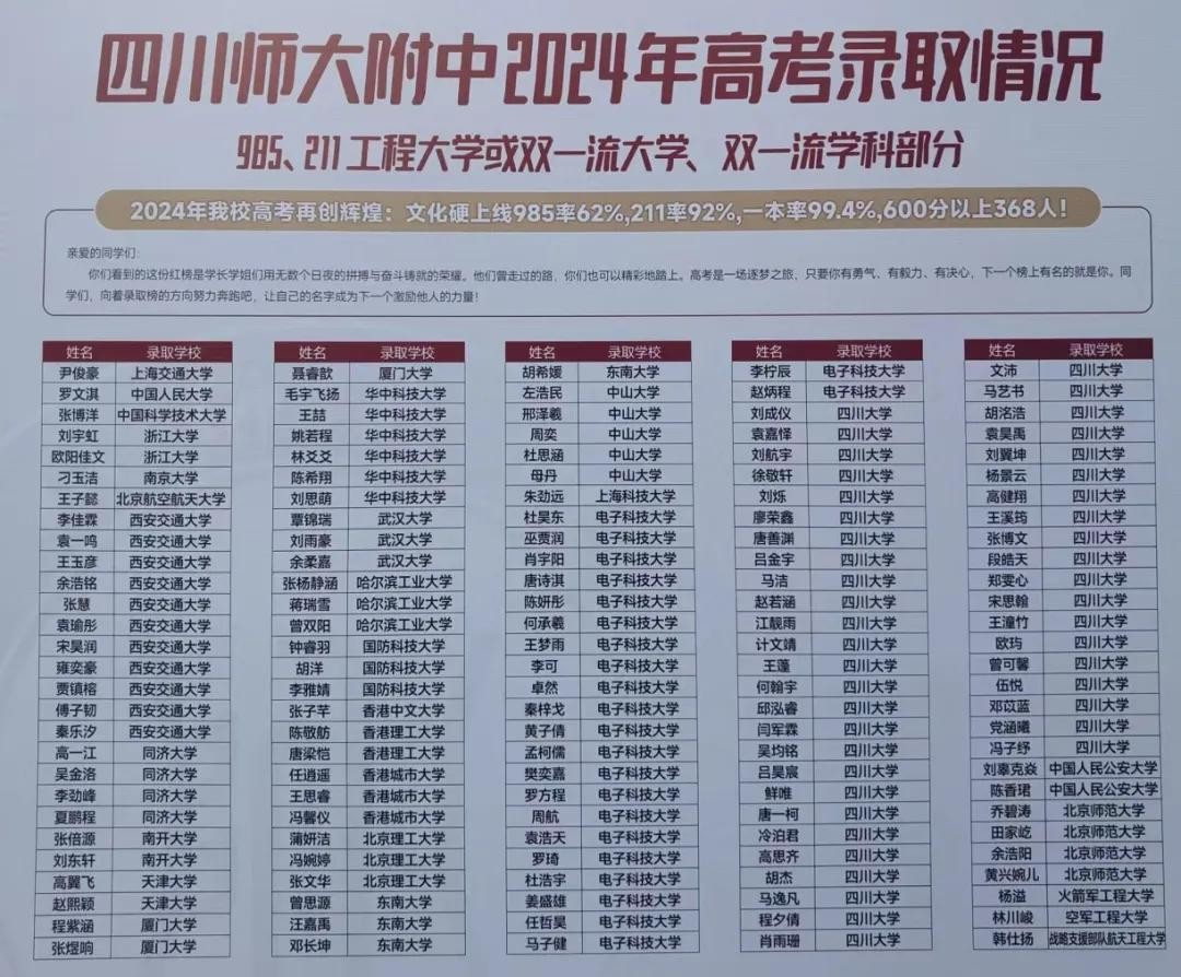 每年升入北大、清华、复旦、上交等著名985高校的不下一半,升入211高校的更是多如牛毛。除了竞赛生这条赛道外,川师大附中稳扎稳打的实力,依然十分瞩目。