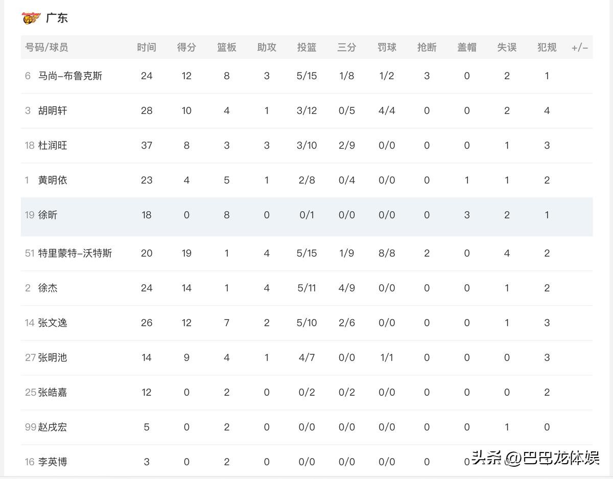 国手胡明轩本场比赛发挥最糟糕,整整上场将近30分钟,只是拿到10分而,正负值超-30分。这无疑是他本赛季最差的一战,让人大跌眼镜。杜润旺也没有达到应有的投篮效率,防守也不行,这样的表现让广东队的形势雪上加霜。胡明轩和杜润旺,10分打3分吧。