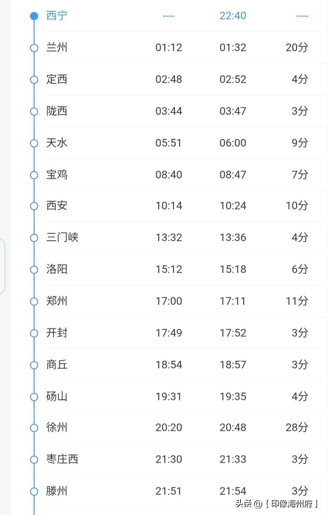 西宁、兰州、定西、陇西、天水、宝鸡、西安、三门峡、洛阳、郑州、开封、商丘、砀山、徐州、枣庄西、滕州、邹城、兖州、泰山、济南、潍坊、青岛北。
