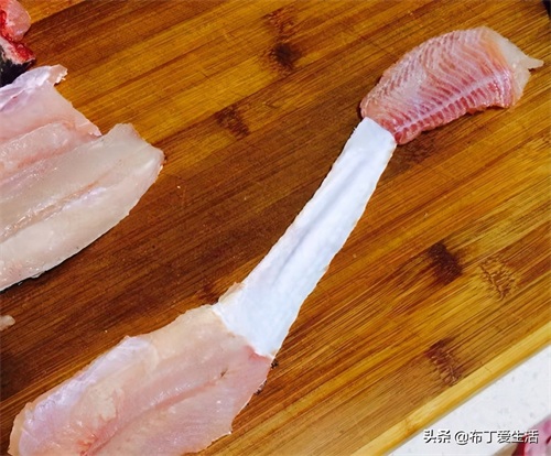 3.去鱼皮的时候要看着鱼皮切,防止将鱼皮切断,否则去鱼皮就不那么容易了。