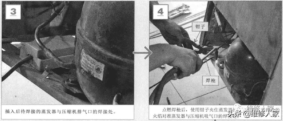 将加工后的蒸发器排气口管插入压缩机的吸气口,插入后待焊接的蒸发器与压缩机排气口的焊接处,点燃焊枪后,使用钳子夹住蒸发器排气口管路,将焊枪的火焰对准蒸发器与压缩机吸气口的焊接处。当焊接处铜管被加热至暗红色时,将焊条放置到焊口处使熔化的焊条均匀的包围在焊接口处。