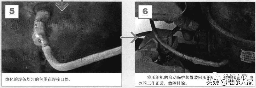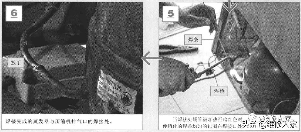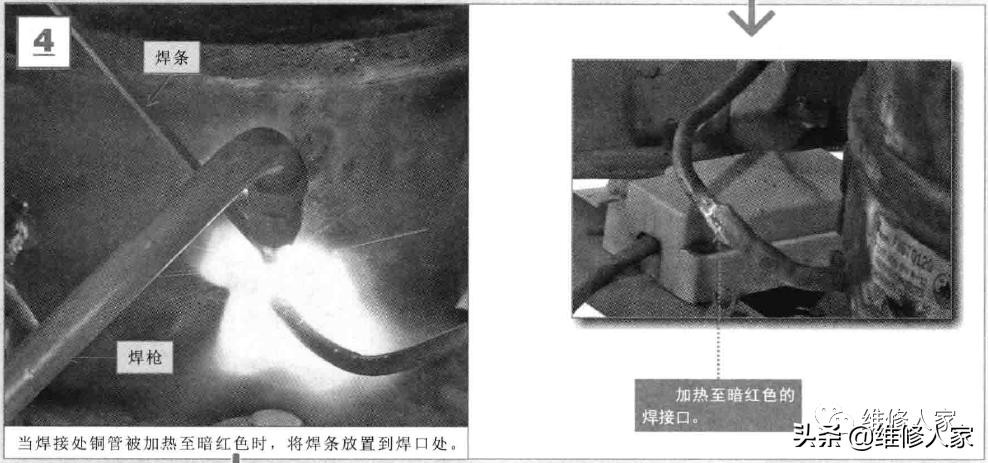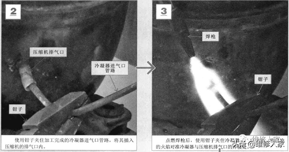 使用钳子夹住加工完成的冷凝器进气口管路,将其插入压缩机的排气口内。点燃焊枪后,使用钳子夹住冷凝器进气口管路,将焊枪的火焰对准冷凝器与压缩机排景口的焊接处。当焊接处铜管被加热至暗红色时,将焊条放置到焊口处,完成焊接。